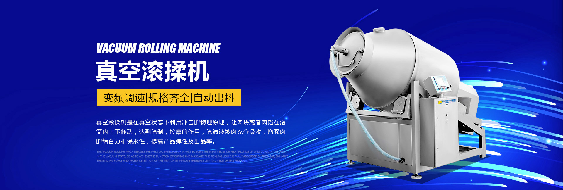 公司主要生產(chǎn)不銹鋼制品食品機(jī)械:各種規(guī)格型號真空滾揉機(jī)、制冷滾揉機(jī)、提升機(jī)、電加熱夾層鍋、肉丸機(jī)、真空攪拌機(jī)、絞肉機(jī)、灌腸機(jī)、打卡機(jī)、線扎機(jī)、斬拌機(jī)、鹽水注射機(jī)、煙熏爐、油炸機(jī)、巴氏殺菌線、連續(xù)油炸線、肉丸成型水煮線、醬鹵生產(chǎn)線、肉丸破碎機(jī)、真空包裝機(jī)、洗袋風(fēng)干機(jī)、豬頭劈半機(jī)、不銹鋼火腿模具、肉斗車、案桌、煙熏車、屠宰類機(jī)械設(shè)備、清洗風(fēng)干設(shè)備、肉類解凍設(shè)備、滾筒拌料機(jī)等。產(chǎn)品廣泛適用于火腿腸、肉丸、肉串、鹵制品、海產(chǎn)品、禽類深加工、油炸、泡椒風(fēng)味、速凍水餃、魚豆腐、千葉豆腐、豆腐干、牛肉干、牛排雞排類、禽蛋、麻辣、休閑、水果蔬菜清洗、中央廚房、餐飲連鎖、寵物食品等食品生產(chǎn)。